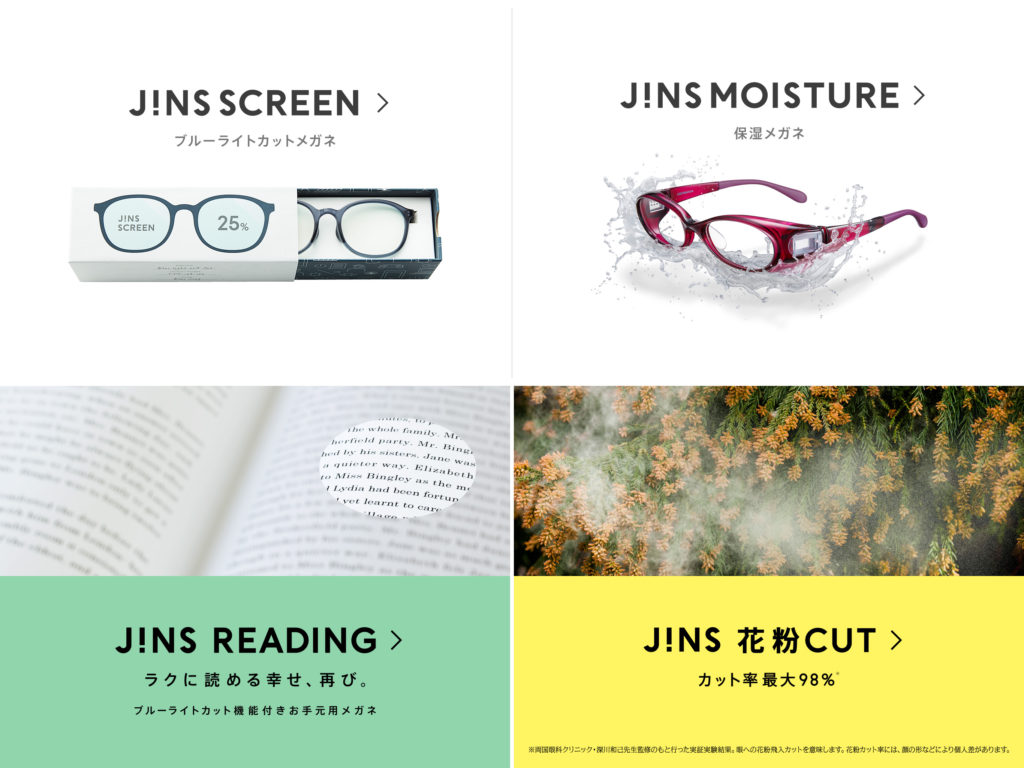 JINSでは機能性アプリという位置付けの商品「PROTECT」「MOISTURE」「READING」「SCREEN」があり、それぞれが専門性の高い特徴を有している。